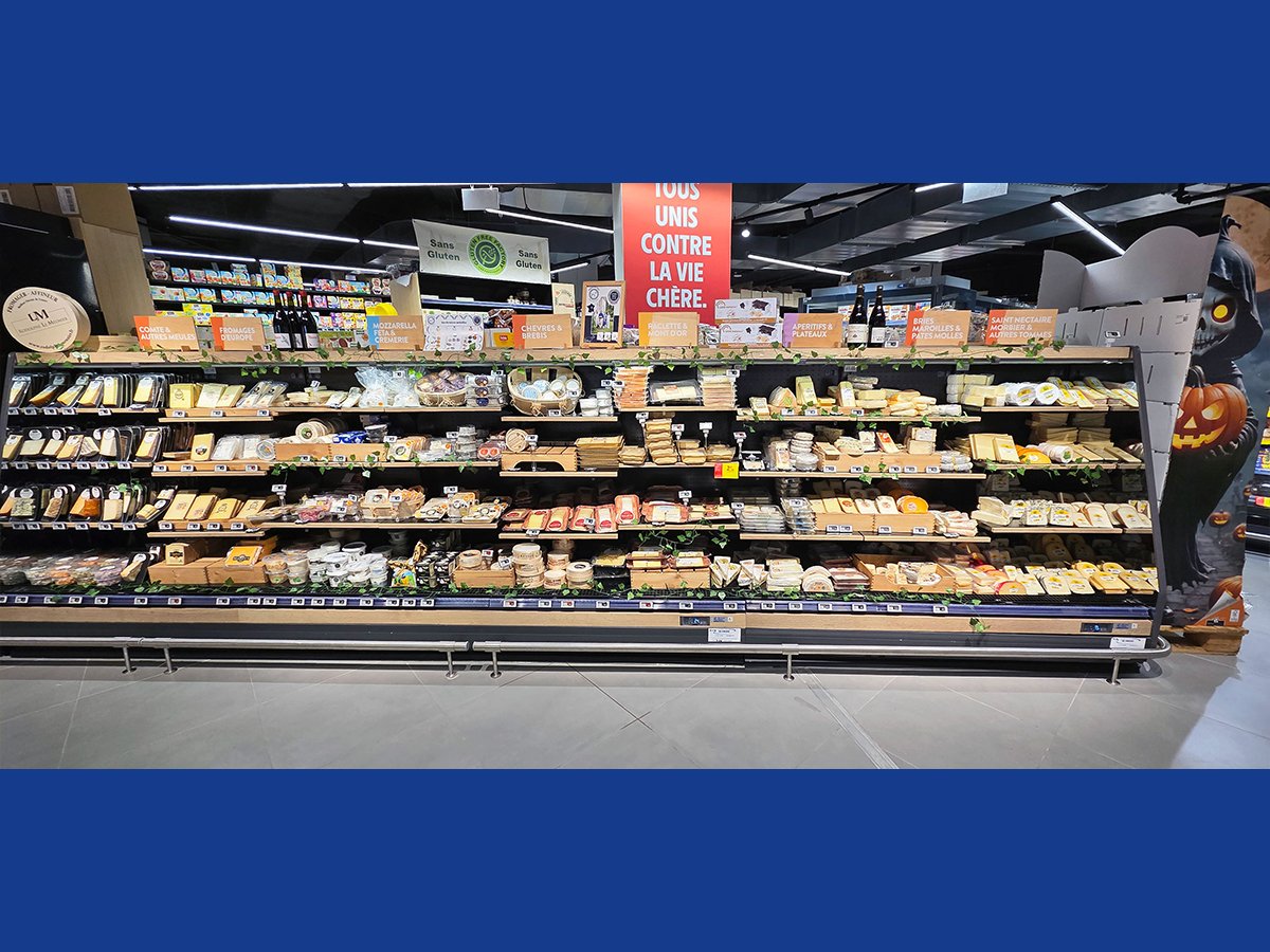 Dès l’entrée, les espaces « prêt à consommer » et fruits et légumes annoncent une zone Marché impactante. On y retrouve notamment une cuisine ouverte et une offre de frais emballé particulièrement soignée. Plus tard dans le parcours, un univers liquide attractif met en avant les offres vins, alcools et bières, servis par des concepts renvoyant une image de spécialiste.