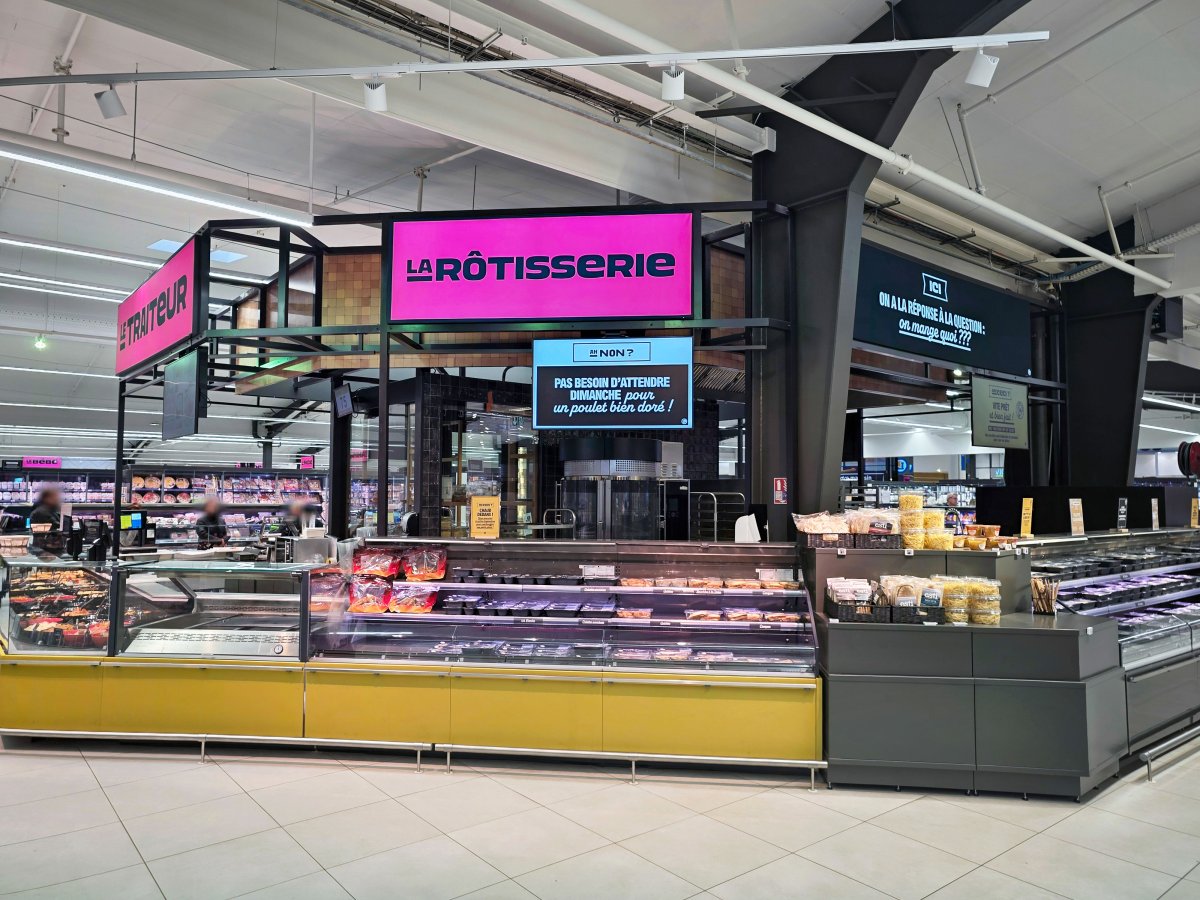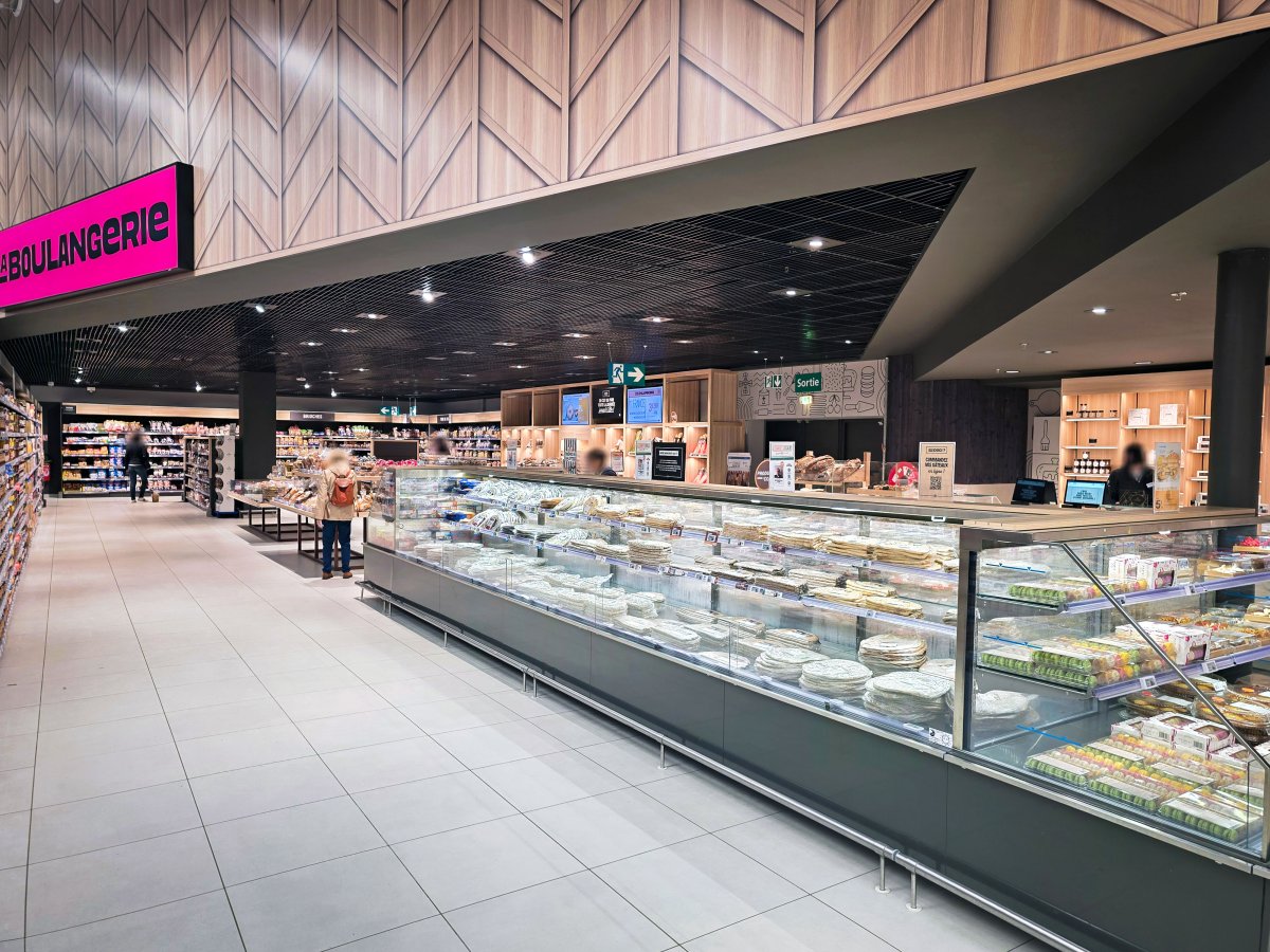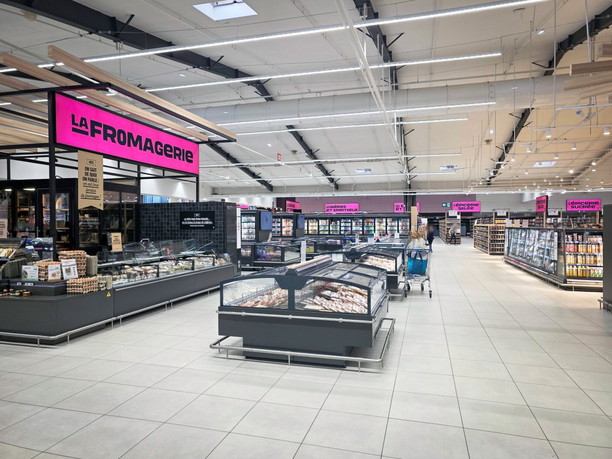 La vaste zone métiers, au cœur du magasin, met en valeur les rayons traditionnels et frais emballés. Chaque espace a été réfléchi pour faciliter l’orientation des consommateurs et proposer des offres différenciantes.